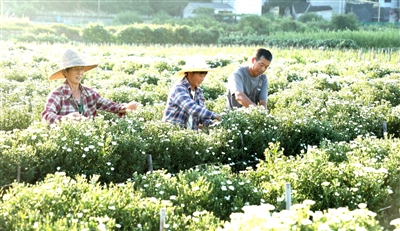 8月18日,歙县富堨镇仁里村村民洪秀琴(右)正与家人一起采摘七月菊。今年,洪秀琴家种植七月菊、贡菊、皇菊共计6亩多,预计菊花单项收入超12万元。 吴建平/摄