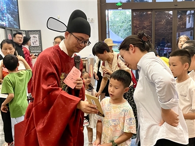 8月15日,工作人员在介绍通关奖励。当晚,别开生面的“博物馆奇妙夜之明妃之谜”活动在安徽徽州历史博物馆举办。活动中,参与者兴致高昂,积极探寻馆藏背后的传奇故事,在趣味互动中真切触摸历史的温度,不仅收获了知识与乐趣,更让文化传播焕发新的活力。 冯溪孜/摄
