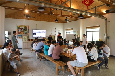 8月4日上午,在九龙峰生态保护·向善实践志愿服务站内,上岭村村民、九龙峰生态导赏员林森旺正热情地向一群亲子研学家庭讲解生态知识。这是今年以来,腾讯创新型党建项目与黄山九龙峰省级自然保护区合作的第五期研学活动。