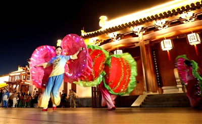 "> ▲8月14日晚,歙县北岸镇呈村降村农民走进古城,表演非遗“蛤蜊舞”。