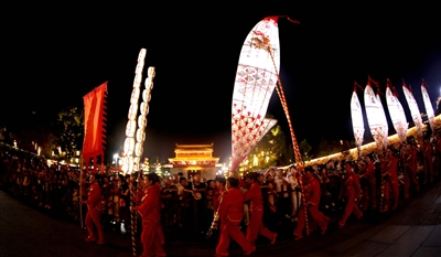 "> ▲8月19日晚,歙县许村镇许村村农民进城表演非遗“许村大刀灯”。