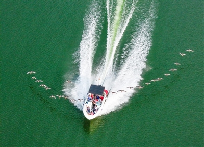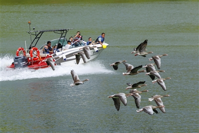 当日,游客搭乘快艇破浪而行,数十只经专业训练的鸿雁展翅凌空、优雅伴飞,与青山碧水相映成趣,共同勾勒出一幅人与自然和谐共生的生态画卷。