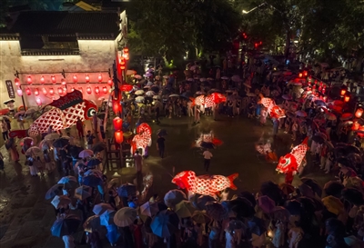 8月21日晚,尽管天空飘着小雨,徽州区呈坎古村鱼灯巡游依旧如期上演,吸引了不少游客驻足观赏。 樊成柱/摄