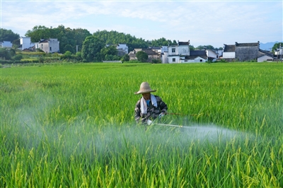 8月24日,黟县各地农民抢抓农时积极开展农业生产,田间地头呈现一片繁忙景象。图为宏村镇龙江村,村民在稻田里喷洒生物农药。 许家栋/摄