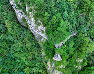 从白鹅岭石棚到始信峰凤仪松这段游步道,自高空俯瞰,像是修建在三棱柱体绝壁上,一面连着山体,两面绝壁临渊。受花岗岩体风化和侵蚀作用,尖尖棱角顶面岩层斜坡平缓,景区建设者们遵循保护景源、引导游览、因地制宜、构建序列等原则,设计打造了始信新道,跟进完善景点周边、附近相关配套旅游附属设施,实现游客游览始信峰不走回头路。
