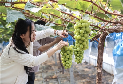 8月27日,游客在虹星桥镇长兴轩乐诗农业发展有限公司的葡萄大棚内采摘葡萄。该公司是一家集高科技农业种植、休闲观光、电商销售于一体的现代化农业企业,7—8月主要产出阳光玫瑰葡萄,占地120亩,亩产3000斤。
