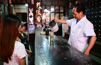 8月28日,在位于黄山市屯溪区的同德仁药店,坐诊医师为游客制作药茶。