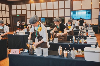 在徽州区岸香·居田谷民宿酒店,民宿管家张敏手持新颁发的职业技能等级证书,正熟练地为游客调制特色茶饮。