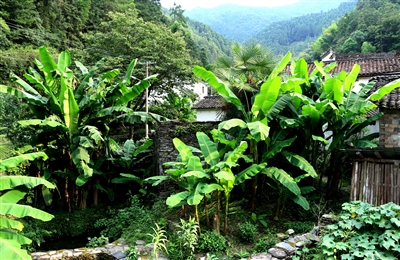 鱼池边,总是种上了芭蕉树,密密麻麻。一丛丛、一簇簇,映着老屋的石头墙。芭蕉叶,是鱼的天然食料,又有清热解毒之疗效,减少鱼病发生,既能遮挡烈日暴晒,夏天能降低水温,冬日叶儿落尽,不影响日照。在通往婺源沱川长达15里的平鼻岭古道两侧,适宜的地段,也种上了芭蕉树。