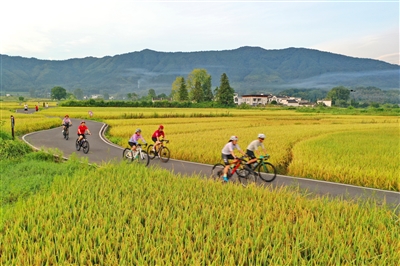 8月30日,黟县碧阳镇关麓村,自行车运动爱好者在风景优美的田间道路上骑行晨练,欣赏乡村美景,享受低碳生活。 许家栋/摄