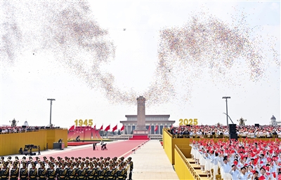 9月3日,纪念中国人民抗日战争暨世界反法西斯战争胜利80周年大会在北京隆重举行。这是纪念大会现场放飞气球。 新华社记者 李鑫/摄