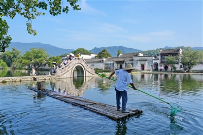 9月5日,黟县宏村景区,工作人员正在清理南湖水面漂浮物。 近年来,该景区积极做好乡村生态环境治理工作,不断加强村落水系环境养护,努力呈现宏村四季清澈的牛形水系。 许家栋/摄