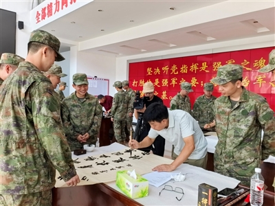 活动现场,书法家们挥毫泼墨,书写间还与预定新兵交流创作心得、讲解书法技艺。预定新兵们主动帮忙裁纸、调墨、晾晒,互动间满是温情。大家手捧专属墨宝与书法家合影留念,红色信念在墨香中悄然扎根。