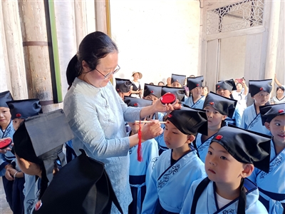 9月11日,黟县宏村学校组织一年级新生来到世界文化遗产地宏村,开展“明理启智 扬帆起航”蒙学礼活动,为孩子们开启“人生第一课”,推进学校“徽文化+”特色教育。 余长舟/摄
