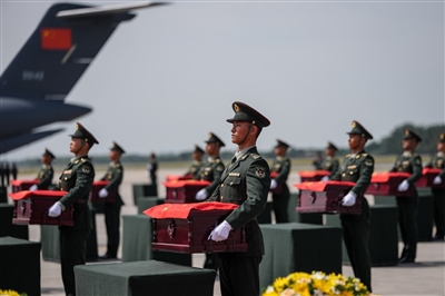 9月12日,第十二批在韩中国人民志愿军烈士遗骸回国。这是在沈阳桃仙国际机场,礼兵将殓放志愿军烈士遗骸的棺椁从棺椁摆放区护送上车。