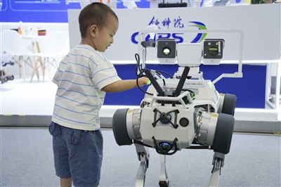 9月14日,小朋友在环境服务专题展区与机器狗互动。
