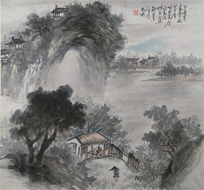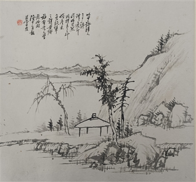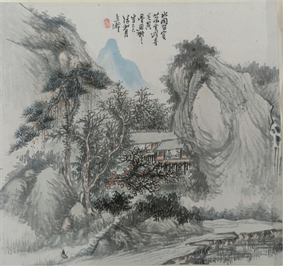 第八幅题款:翠柳迎风拂涧泉,溪中时见钓鱼船;渔翁贪玩前山景,镇日句留到普天,以棠画。邵鸿恩博采众长,由高克恭、董其昌,直追李成;也深受新安画派查士标、姑熟画派萧云从的影响;同时又融入“四王”绘画特色,表现出深厚的传统功力。邵鸿恩的绘画活动主要在徽州,受到新安大好山水的熏陶,又得到徽州文化的浸润,原生态的乡野风光、悠然的文人场景跃然纸上。这幅作品全然展示出邵鸿恩高超的笔墨技艺、鲜明的绘画风格和清新雅致的艺术特征,是对徽州风情的直抒胸臆。