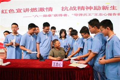 9月15日上午,“八一勋章”获得者、“导弹兵王”王忠心受邀前往黄山新教育学校,为400多名七年级新生上了一堂生动的国防教育课。 授课一结束,学生们纷纷涌上讲台,请崇拜的偶像、心中“明星”王忠心签名寄语。这场“零距离”的互动,将忠诚与信仰的种子深深植入了每一位青少年的心田。 武时化 程勇/摄