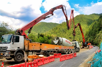 9月15日,在S222线休宁上三峰段灾害防治工程施工现场,施工人员利用水泥混凝土泵车浇筑明洞外侧柱桩基础。据悉,整个明洞建设主体工程将于年底前完成。 曹集林 项振华/摄