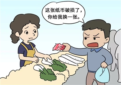 收到顾客的真钞后,变换手法,将事先撕角的假币与真币调包,然后以残币为由要求重新更换,趁机把假币退回给受害者。
