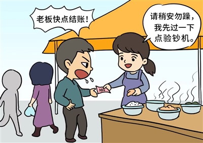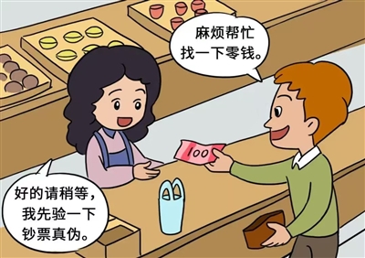当遇持大面额纸币购买小额商品的情况时,或是交易发生在昏暗的地方时,需仔细辨别真伪。