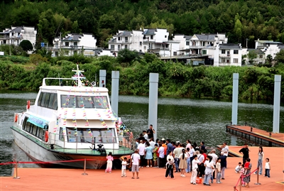 近日,休宁县月潭湖旅游区迎来开放后首个旅游高峰。旅游码头排起了长队,“月潭湖号”大型游船劈波斩浪,带领乘客领略宜人风光。 汪红兴/摄