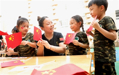 9月29日,歙县育鸿幼儿园举办“雏鹰绘国,萌娃献礼”主题活动。小朋友们在老师和家长指导下,绘画国旗、拼图国旗、制作国旗,与鲜艳国旗合影。