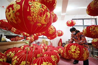 1月19日,河南省焦作市温县北冷乡许北张村一家灯笼作坊的工人在整理灯笼。