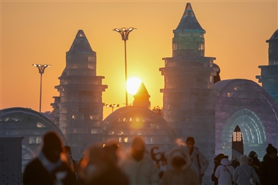 1月18日,游客在哈尔滨冰雪大世界游玩。 夕阳西下,落日余晖为哈尔滨冰雪大世界披上暖金霞光,游客尽享冬日的浪漫与温柔。 新华社记者 王建威/摄