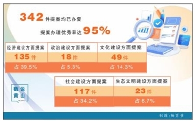 经济建设方面提案135件,占39.5%。关于融入长三角一体化协同发展、深化衢黄南饶联动、推进皖南国际文化旅游示范区建设等提案,为融入和服务国家、省区域协调发展战略发挥了促进作用。关于加快我市康养产业发展的建议等13件相关提案,被吸纳入《关于推进康养产业高质量发展的实施意见》中,推动形成全市共同发力的医疗康养产业工作格局。关于搭乘“智改数转”赋能“专精特新”、发展低空经济、演艺经济、抢抓合成生物产业赛道等建议,为我市发展新兴产业和未来产业提供了有价值的参考。关于加强山区优质粮食生产基地建设、健全乡村运营机制、振兴黄山“徽菇”等建议,相关部门在实施“千村引领、万村升级”工程中转化为具体举措。