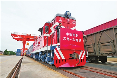 当日,一趟满载110个标准箱日用百货、汽车配件、机械设备等出口货物的中欧班列从义乌西站驶出,驶往逾1.3万公里外的西班牙马德里。义乌中欧班列迎来开行十周年节点。