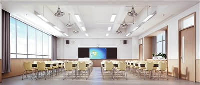 在设计理念上,该校以“绿色”“开放”“创新”的建筑结构呼应现代化教育理念,外观采用米白色为主色调,辅以充满青春活力的橙色和绿色,营造出有活力、有激情的学习氛围。教学区内设有屋顶花园和室外半围合庭院,为学生提供户外交流学习空间。学校内设计了风雨连廊,具备良好的遮风避雨效果,确保各个建筑单体之间的便捷通行。