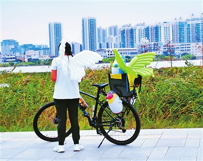 公园一角,卖充气玩具的小姐姐给自己的自行车装上了玩具翅膀,让这一刻的画面充满了萌趣。 拍客:何芳 地点:西堤公园 稿费:50元