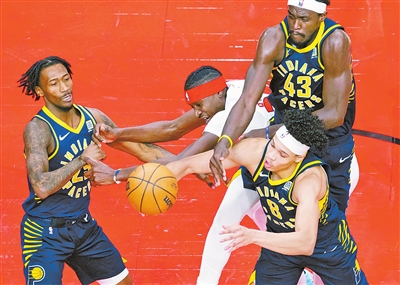 11月18日,猛龙队球员布歇(左二)与步行者队球员在比赛中拼抢。