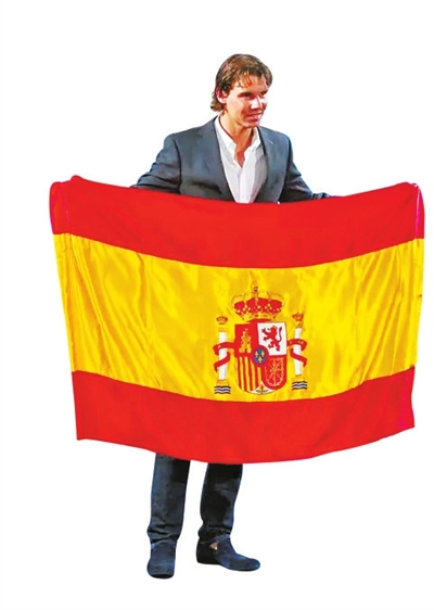 ●2012年7月14日,纳达尔手持西班牙国旗留影。当日,2012伦敦奥运会西班牙代表团授旗仪式在马德里举行,纳达尔将在奥运会开幕式上担任西班牙代表团旗手。