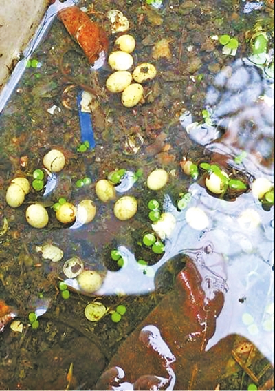 某居民楼小花园出现一堆非洲大蜗牛卵。