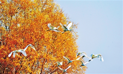 初冬时节,泛舟白洋淀,各类水鸟不断飞过,在一丛丛金黄芦苇的映衬下,一派热闹景象。
