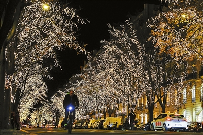 11月20日,一名男子骑车从法国巴黎蒙田大道的灯饰下经过。