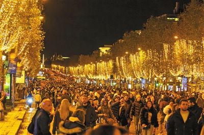 11月24日,人们在法国巴黎香榭丽舍大街上欣赏节日灯饰。当日,法国巴黎著名的香榭丽舍大街迎来一年一度的点灯仪式。从11月24日起至2025年1月初,整条香榭丽舍大街将在每天17点至午夜被喜庆的节日灯饰点亮,12月24日和12月31日将通宵不灭。