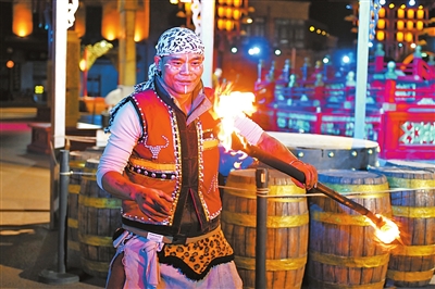 日前,演员在银川市漫葡·看见贺兰沉浸式演艺小镇为游客带来夜间表演。