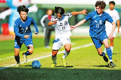 11月27日,上海队球员张俊杰(中)在比赛中进攻。 当日,在中华人民共和国第一届青少年三大球运动会足球项目男子金牌赛中,山东队1比0胜上海队,夺得冠军。 新华社发