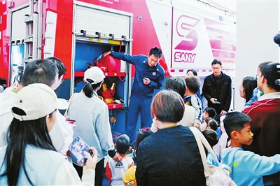 体验中心宣传员带领家长和小朋友参观消防车辆。