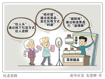 日前,带货主播“麦琪啦”在直播间销售保健品违规宣传一事引发关注。 近年来,直播间的保健品已成为消费者权益受损的“重灾区”。不少老人“一边上网,一边上当”,不仅花费大量时间和钱财,也面临健康风险。 为吸引“客户”、提升黏性,不少保健品直播会“环环相扣”设陷阱。 新华社发