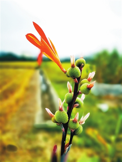 菜地里,一株美人蕉结满果实,绽放着一朵鲜艳的花儿。 拍客:林集源 地点:斗门镇大濠冲村 稿费:30元