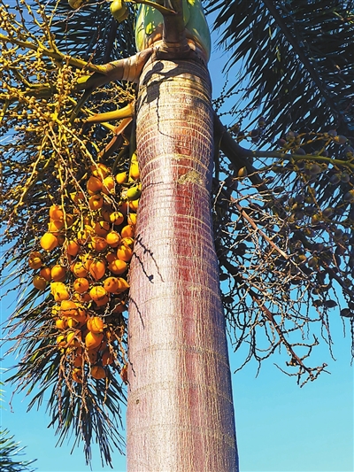 公园里的一棵棕榈树,一挂果实累累,一挂果实枯萎。