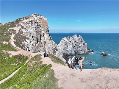 11月29日,游客在霞浦县海岛乡东礵岛上游玩(无人机照片)。福建省霞浦县拥有着曲折的海岸线和众多浅海滩涂与岛礁,形成了山海相拥、滩岛相映的黄金海岸美景。 新华社发