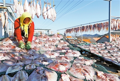 12月3日,山东省青岛市即墨区鳌山卫街道垛石村的渔民在晾晒鱼干。初冬时节,山东省青岛市即墨区沿海一带的渔民趁天气晴好,将捕获的海鱼经过切割、腌制、晾晒等工序加工成鱼干,这一景观也带旺了当地旅游。 新华社发