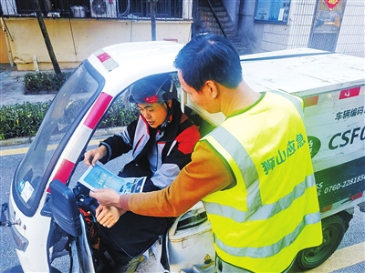 社区工作人员向新业态从业人员宣传文明交通知识。