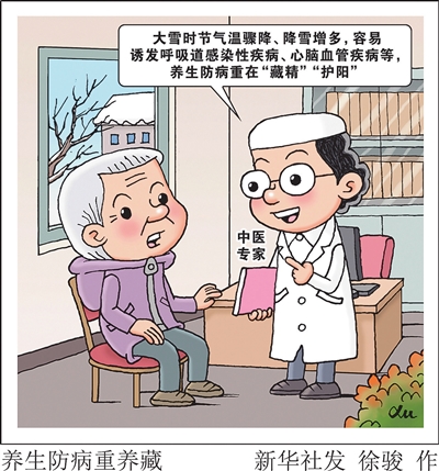 “大雪”标志着仲冬时节正式开始。中医专家提示,大雪时节气温骤降,容易诱发呼吸道感染性疾病、心脑血管疾病等,养生防病重在“藏精”“护阳”。