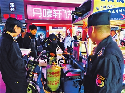 检查组对夜市商户的瓶装液化石油气使用情况进行全面检查,重点检查液化石油气瓶来源以及可调式压力阀、灶具熄火保护装置、软管等是否符合要求。
